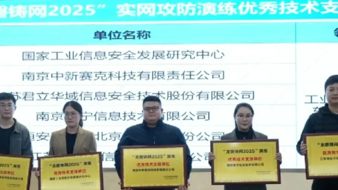 10月23日江苏省通信管理局主办——江苏省护航新型工业化网络和数据安全暨“铸网2025”实网攻防演练点评会,中新赛克凭借在网络安全演练中的卓越技术支撑与突出贡献,荣获“优秀技术支撑单位”称号;同时中新赛克员工凭借出色的专业能力与表现,获评 “优秀支撑人员” 荣誉称号。