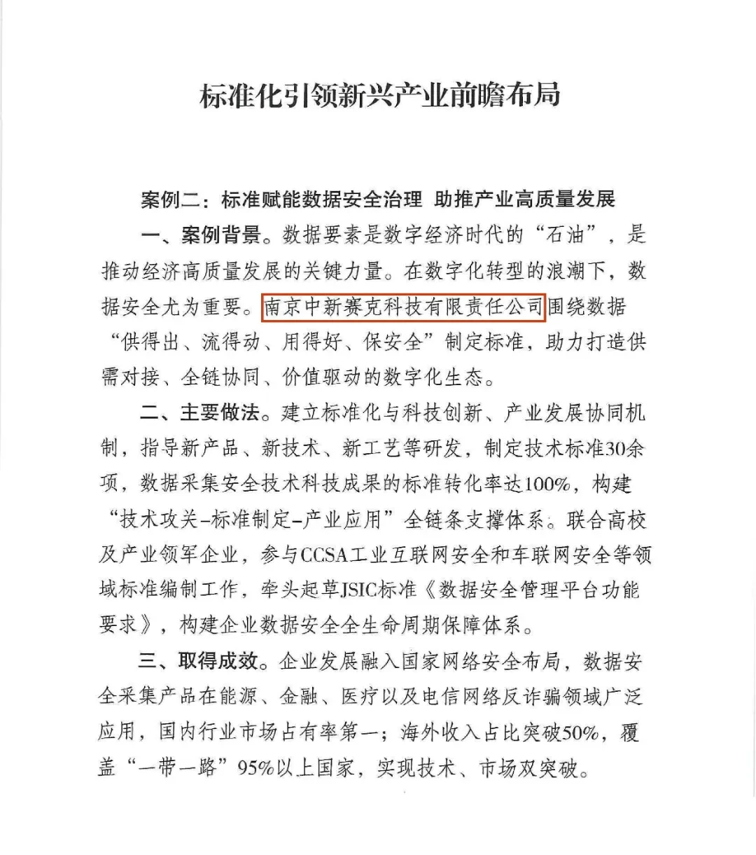 近日,江苏省市场监督管理局发布了《关于发布标准化赋能高质量发展典型案例的通知》,展示了全省在“引领产业升级、推动科技创新、促进绿色发展、提升开放水平等”各个方面的典型案例。中新赛克申报的《标准赋能数据安全治理,助推企业高质量发展》案例,凭借在“标准化引领新兴产业前瞻布局”维度的突出成效,成功入围本批“典型案例”。